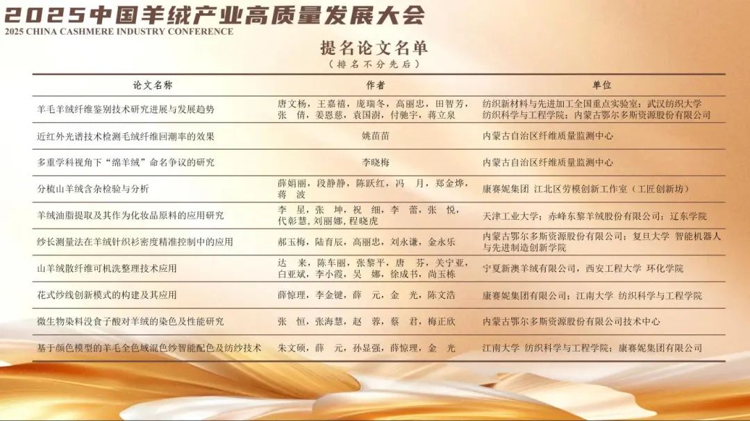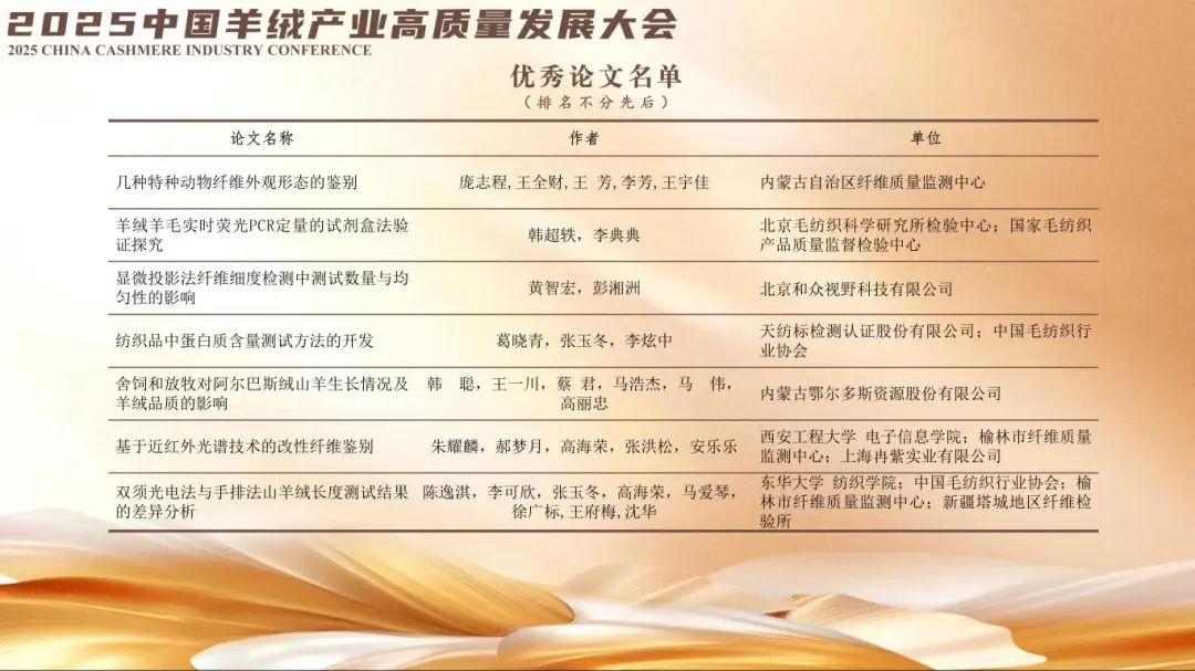 在专题对话环节,中国毛纺织行业协会副会长刘焱介绍,针对目前毛纺织行业内关于绵羊毛、山羊绒及其他特种动物纤维,在检验检测过程中暂无统一处理依据的疑点问题;因操作和判定尺度不一致,导致检验检测结果存在较大差异的难点问题,中国毛纺织行业协会山羊绒专业委员会组织起草了《绵羊毛、山羊绒及其他特种动物纤维检验检测中未明确事项技术处理指引及建议操作指南》。 会议邀请内蒙古自治区纤维质量监测中心主任王莉,内蒙古鄂尔多斯羊绒集团技术中心主任、内蒙古鄂尔多斯资源股份有限公司绒纺事业部副总经理高丽忠,天祥(天津) 质量技术服务有限公司高级技术经理陈继红,从纤维的定性定量、含粗、长度问题,分梳异质绵羊毛标准制定与标准体系协调配套问题,特殊工艺处理(丝光、防缩、拉伸等)、手排长度操作要点及注意事项等方面解读了操作指南,提出希望通过实践不断修改完善指南,尽量缩小检测差异,通过绒毛鉴别和检测水平的不断提高,助推山羊绒产业高质量发展。 会议还发布了第九届国际山羊绒检测技术研讨会优秀论文推选结果。本次研讨会共征集论文 30 篇,经中毛协组织专家,表决通过《几种特种动物纤维外观形态的鉴别》等 7 篇论文为优秀论文,表决通过《羊毛羊绒纤维鉴别技术研究进展与发展趋势》等 10 篇论文为提名论文。