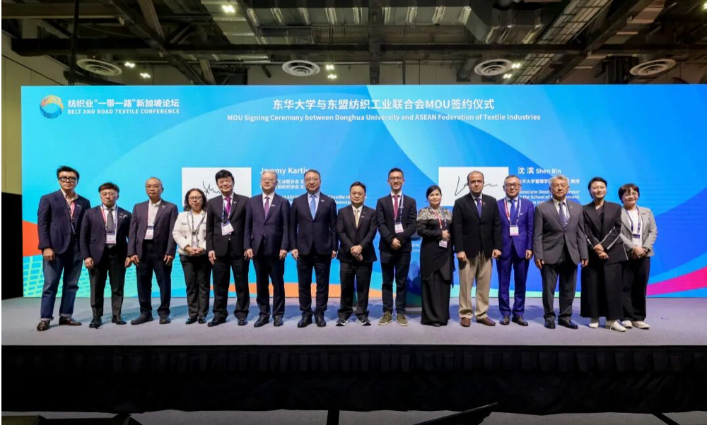 中国纺织工业联合会副会长、中国国际贸易促进委员会纺织行业分会会长徐迎新,与哈萨克斯坦轻工企业协会副会长Natalya Akhshabayeva、吉尔吉斯斯坦缝纫协会主席 Diloramkan Duishobaeva签约,标志着中哈、中吉纺织行业在产业链合作、技术交流等领域将建立长期稳定的合作机制。 东华大学是中国乃至全球纺织服装领域的顶尖学府,也是纺织教育与科技创新的重要高地。东盟纺织工业联合会由东盟地区各国纺织服装商协会联合组成,作为东盟区域行业发展的重要力量,多年来一直致力于推动地区产业协同发展。东华大学和东盟纺联经过友好磋商,决定携手合作,未来将在人才培养、科技创新、绿色低碳、标准互认等方面深入对接,共同服务“一带一路”建设和区域纺织产业高质量发展。