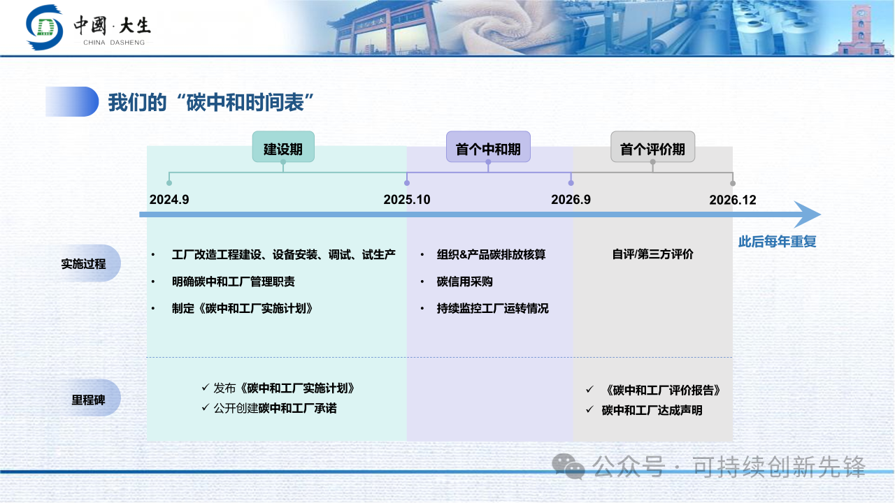 根据《T/CNTAC 187—2023〈纺织行业碳中和工厂创建和评价技术规范〉》,大生集团制定了详细的碳中和实施计划:将全面盘查工厂温室气体排放,推进节能技改、分布式光伏建设、储能电站投用及绿电采购等项目,对无法通过技术手段消除的剩余排放实施碳抵消,最终实现工厂运营范围内的碳中和。