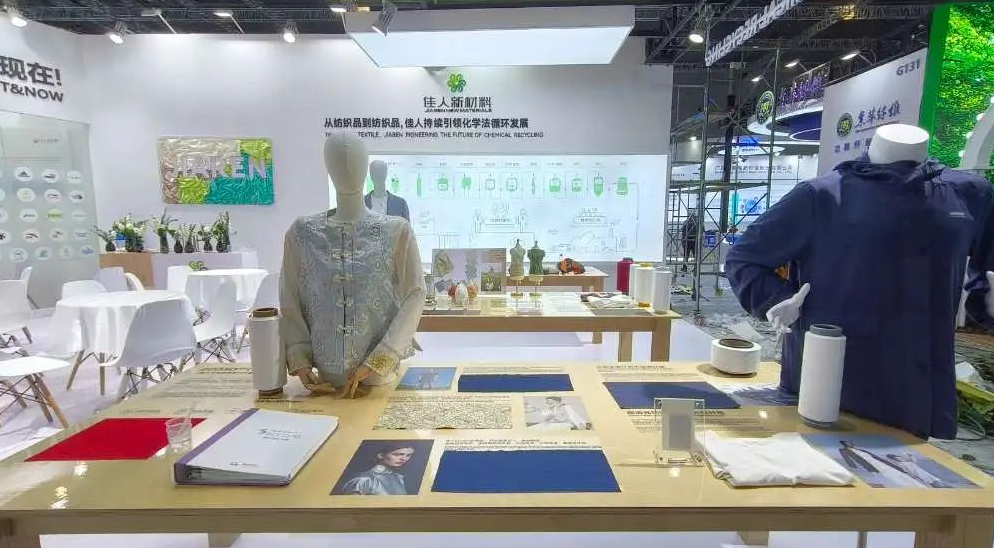 佳人新材料再生涤纶产品展示 浙江佳人新材料有限公司创新研究院于文广博士介绍,目前,佳人新材料最新研发的涤纶纺织品分子级解聚再生技术,可实现纯度99.9%无限循环,攻克了废旧涤纶纺织品杂质分离、除色难题,再生纤维性能达原生级标准。今年3月,佳人新材料发布了采用“分子级链段修饰”技术生产的ECOSO(伊可柔)纤维。该纤维通过聚合过程中的第三单体——亲水基团的引入,实现对染料小分子的高效吸附,提升染色效率,从根本上实现低温染色。此外,这一亲水基团有效改善了传统涤纶的疏水特性,赋予织物吸湿速干功能。同时,浙江佳人与正凯建立化学法循环再生涤纶短纤联合研发生产基地,以T2T化学法再生聚酯短纤为原料,积极开发一系列纱线和面料产品,突破再生短纤应用边界。